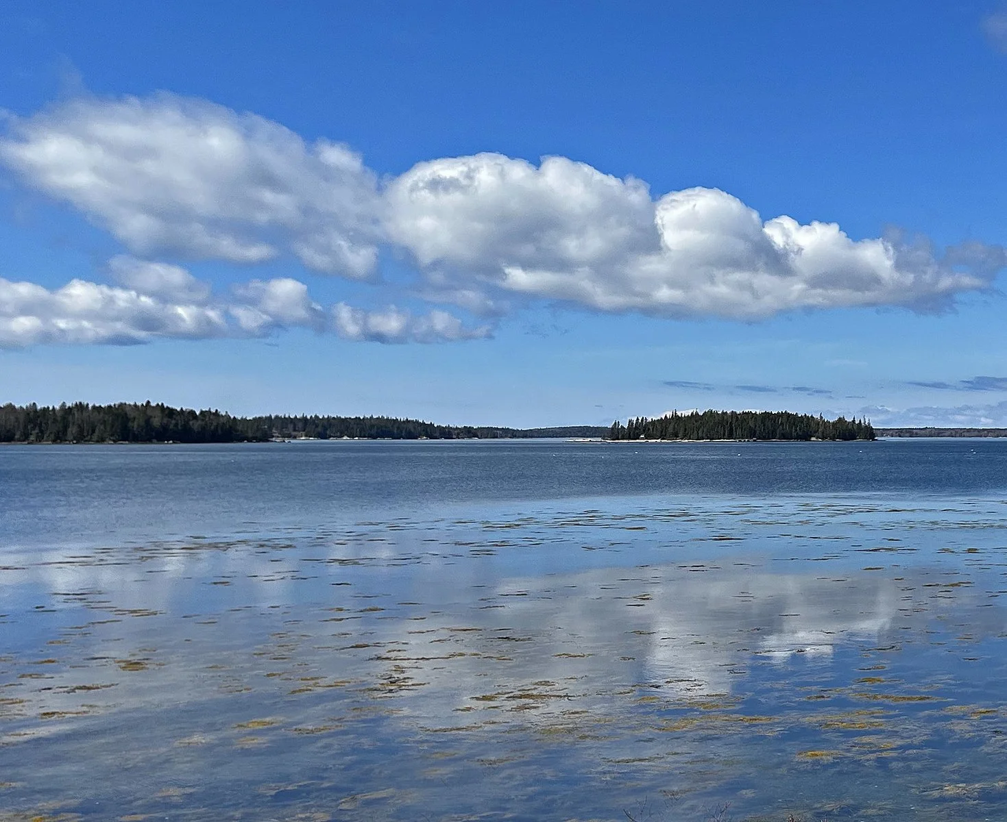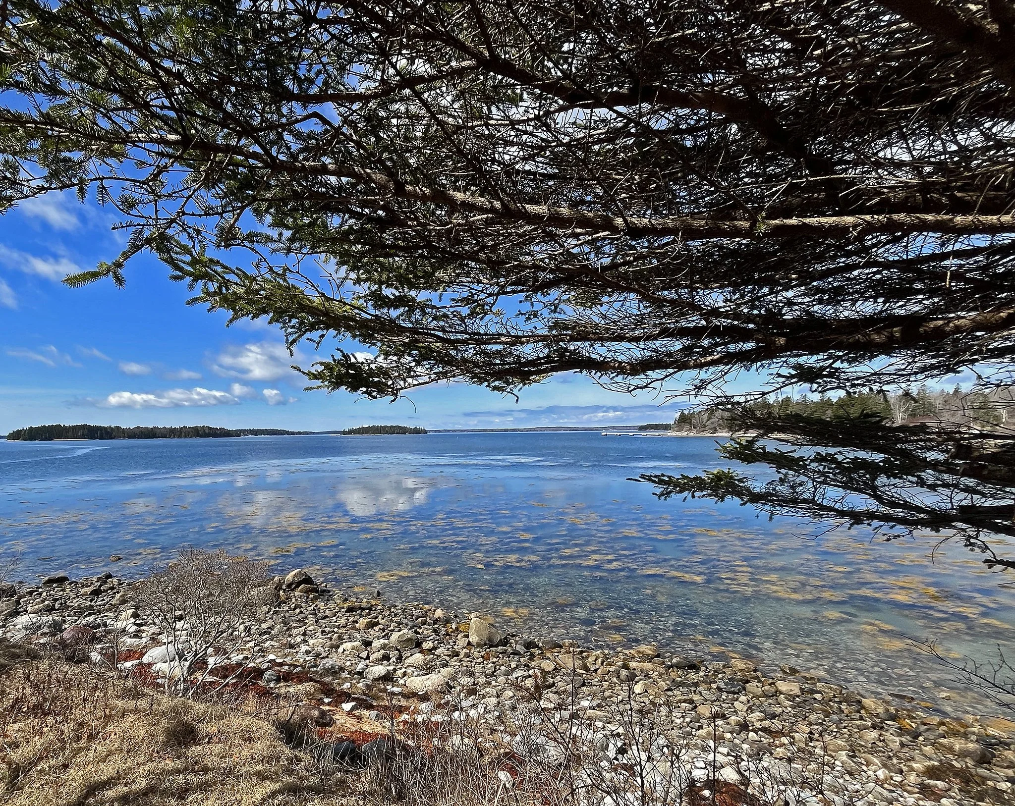 Here you see a spring tide lowering in Brooklin’s Great Cove earlier this week. There was little wind bothering her, so the Cove had time to work on her reflections. As the water receded, she revealed blooms of her swaying rockweed, which soon became tangled mats hiding crabs and snails that waited patiently for the tide to come back. It always has.