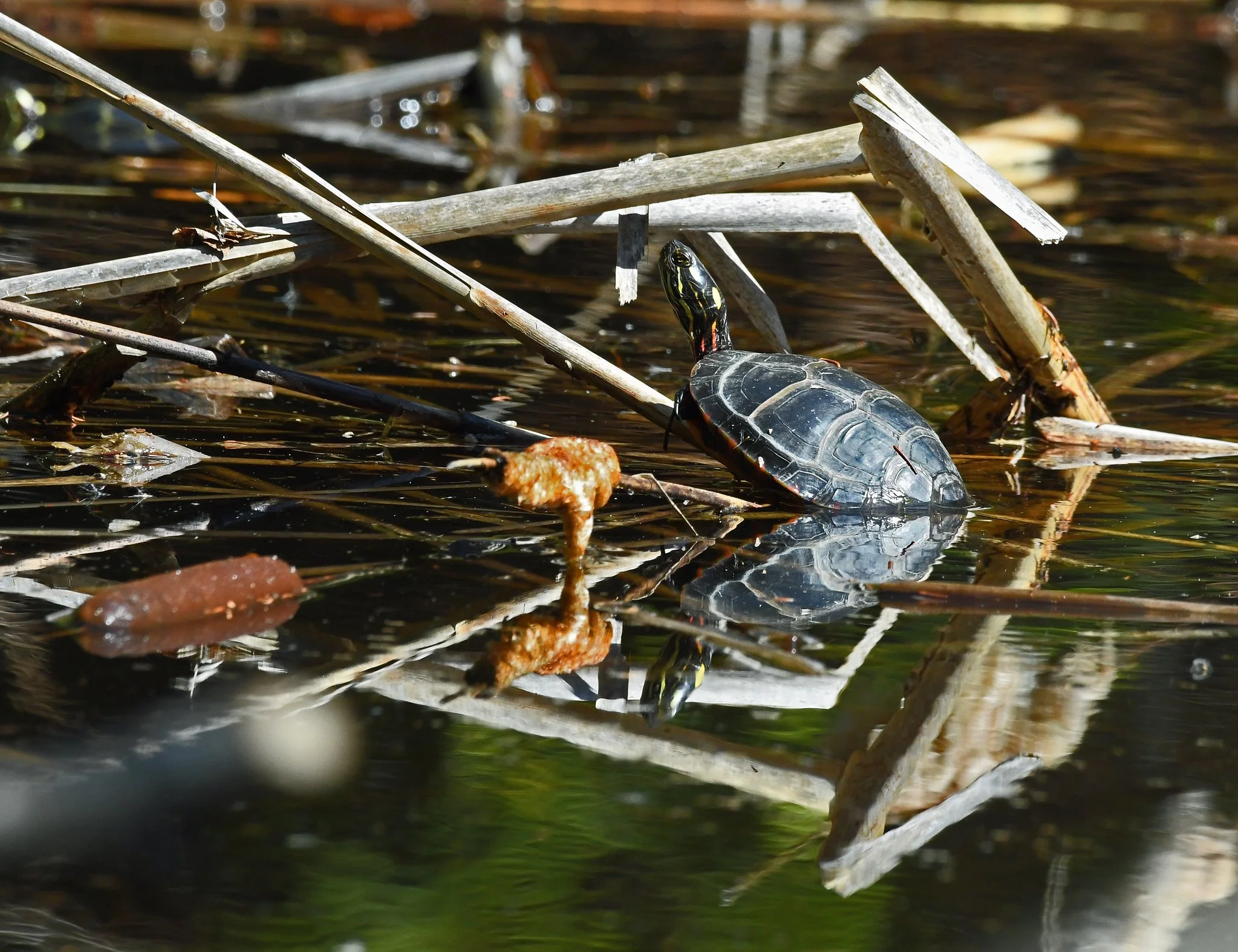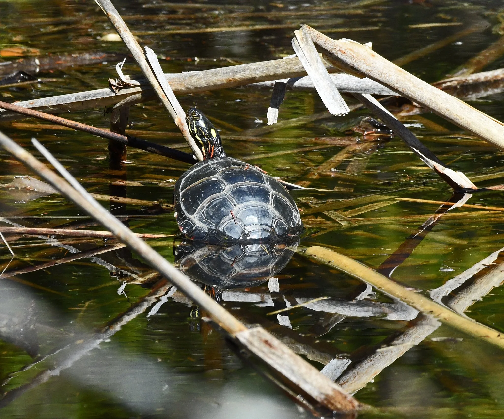 The literature reports that the painted turtle’s diet includes aquatic insects, fish, crustaceans (crayfish), snails, worms, algae, and leafy plants. Young turtles apparently are mostly carnivorous, but they become more herbivorous as they get older. Curiously, PTs have to eat in water. They have virtually fixed tongues and can’t produce saliva; they need water to act as a lubricant to get their food “down.” They swim with their mouths open at the surface or below to catch prey and floating vegetation, then use the water to help ingest their catch.