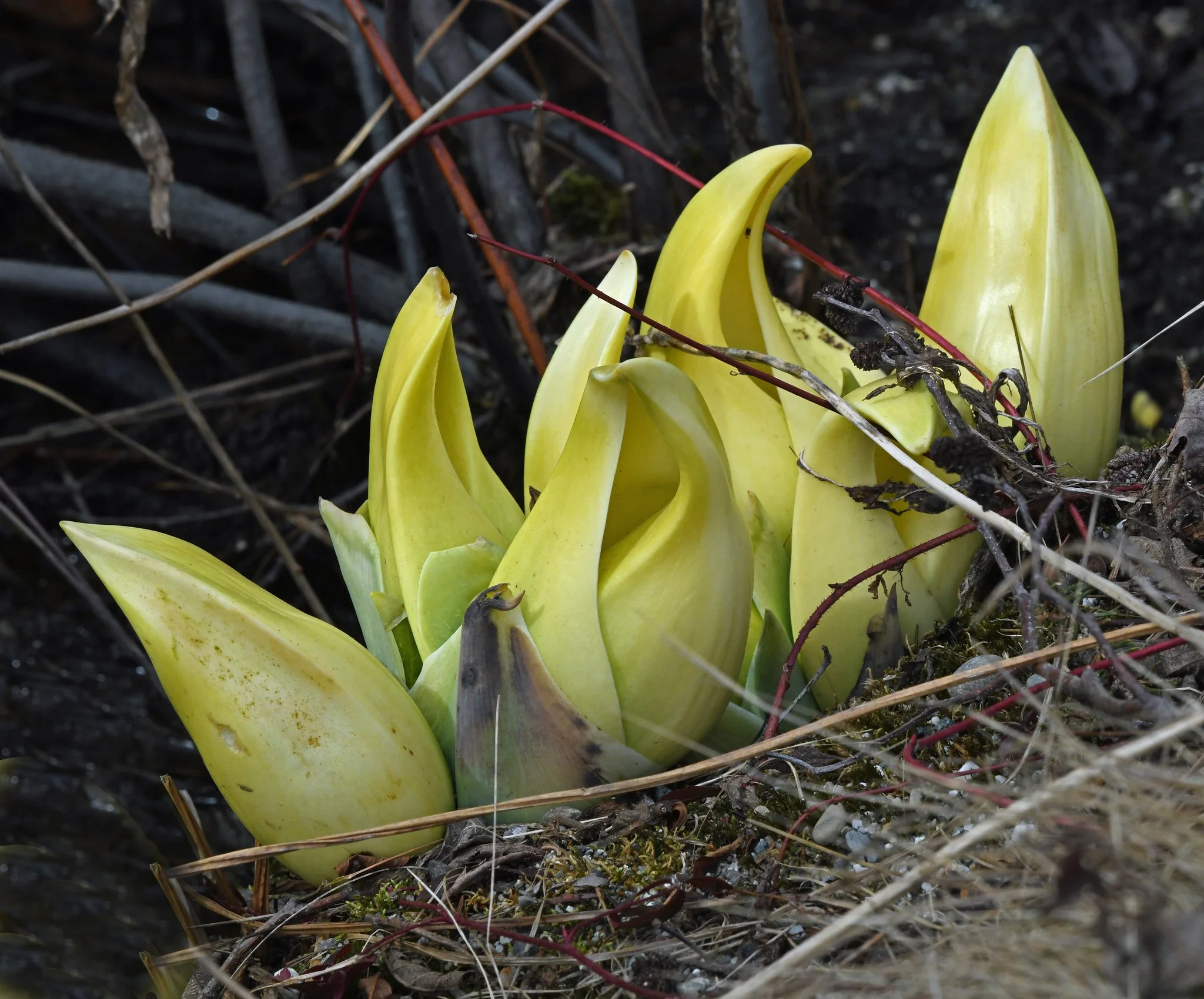 The spathes usually last only a few weeks before the plants’ large and lush green leaves fully emerge and grab as much light as they can. (Images taken in Brooklin, Maine, on April 2, 2026.)