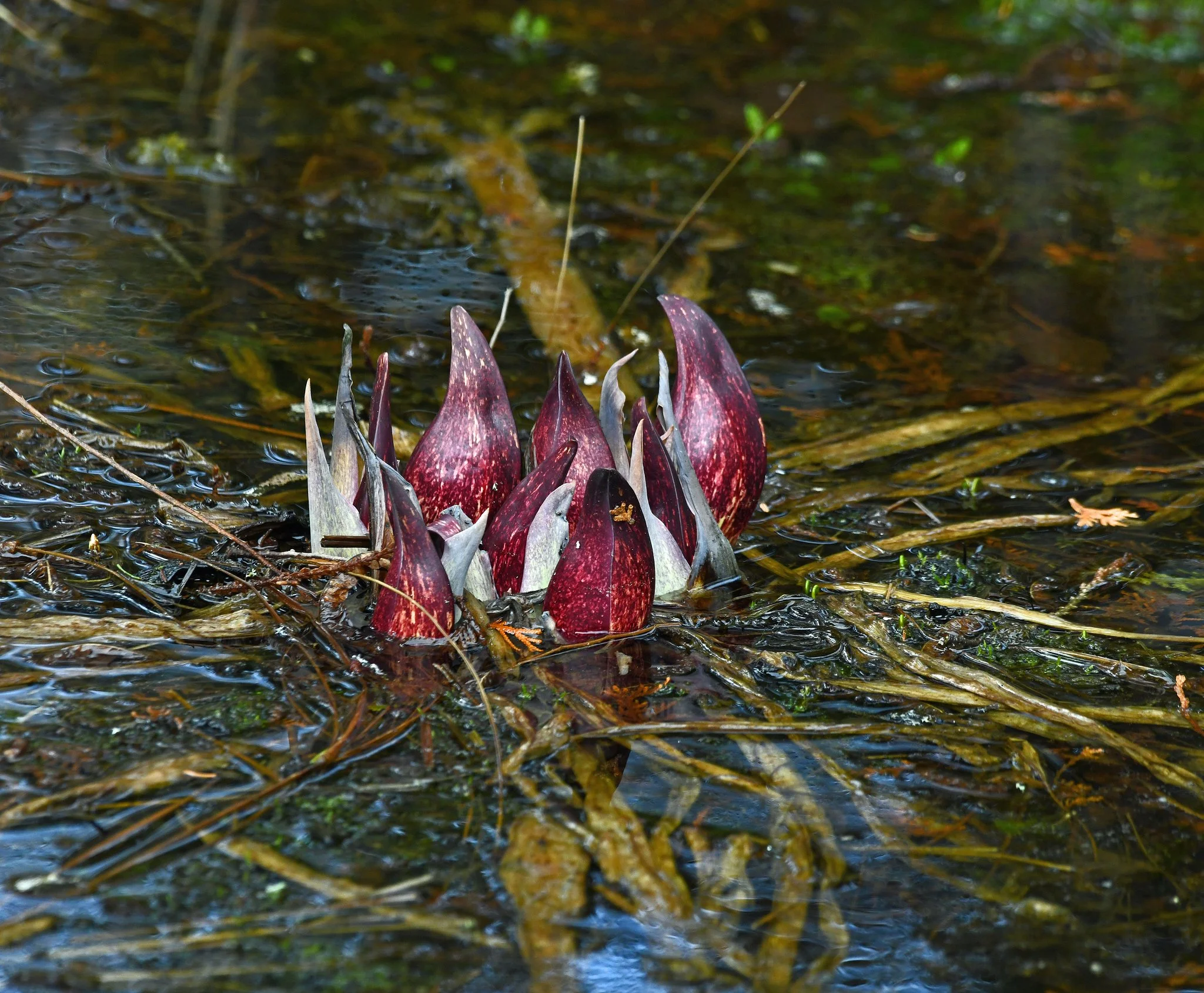 April is doing a good job showering away March’s discarded snow and watering the eastern skunk cabbages. This spring’s crop of those beauties with bad breath may be one of our best. Their curly spathes (flower-protecting modified leaves) are especially varied in color this year.