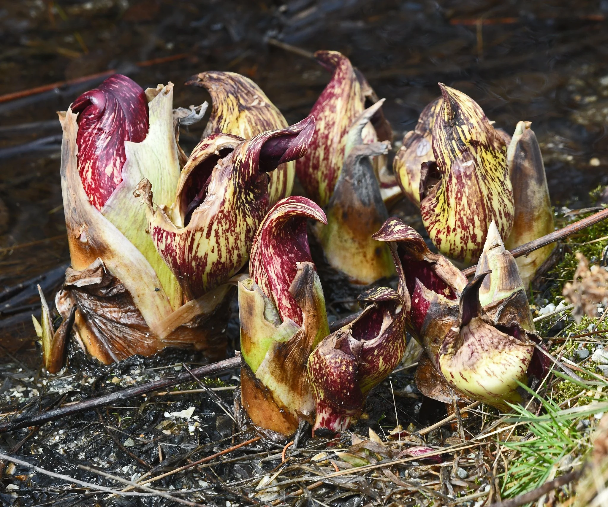 The color variations in the spathes apparently are caused by natural, inherent genetic diversity and environmental adaptation. These variations, often resulting in marbling or solid colors, serve to camouflage the plant against early spring leaf litter.