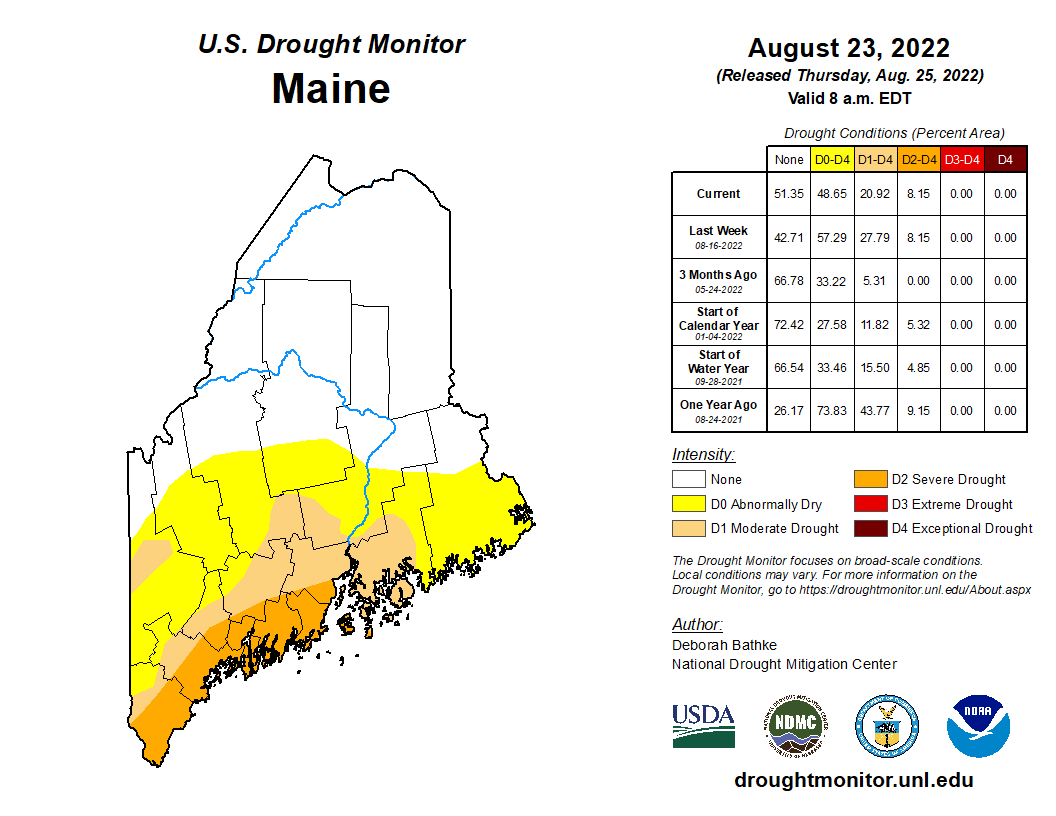 Nonetheless, today’s federal drought report shows that the Maine coast and almost the entire southern half of the State remain abnormally dry, in moderate drought, or in extreme drought as of Tuesday’s data: