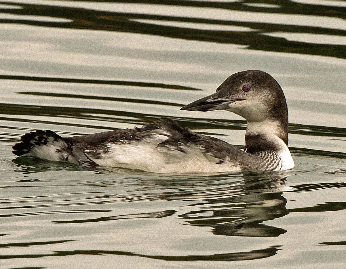 Loons have a low swimming profile that can make them difficult to notice, but summer and fall loons are more noticeable than winter loons. In the summer, male and female breeding loons sport scarlet eyes, ostentatious black-and-white striped and speckled plumage and often give their youngsters a ride on their broad backs. Winter loons of both sexes, however, are darker-eyed loners wearing drab, inconspicuous plumage that makes it harder for literally eagle-eyed predators and binoculared birders to notice them (that’s a winter loon in the accompanying photograph).